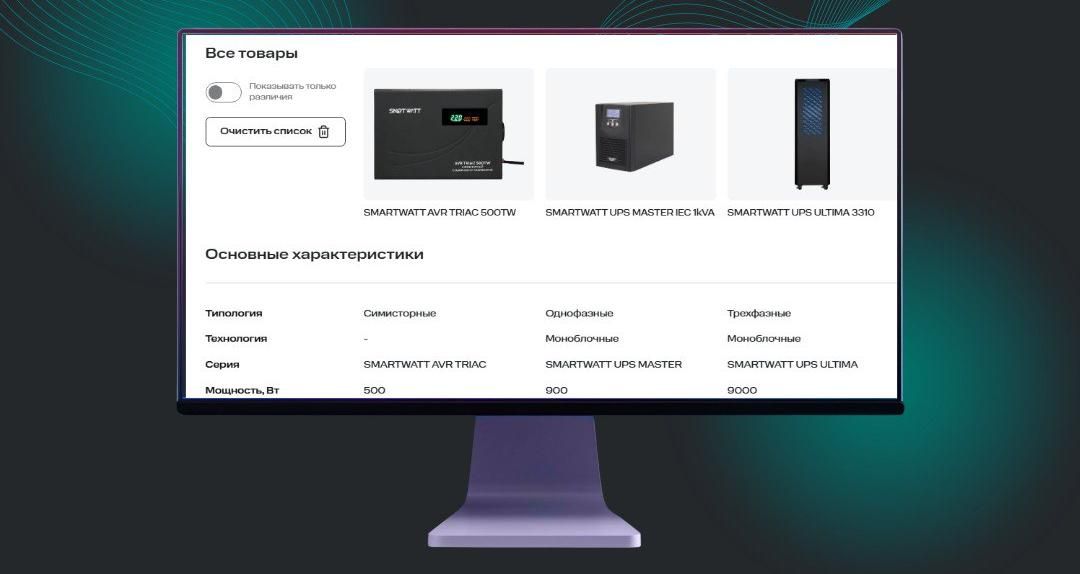 Всего несколько кликов — и перед вами сравнительная таблица по всем характеристикам продуктов. Добавляйте оборудование из любых категорий, изучайте весь перечень свойств или только отличия — сравнить можно до 100 позиций.