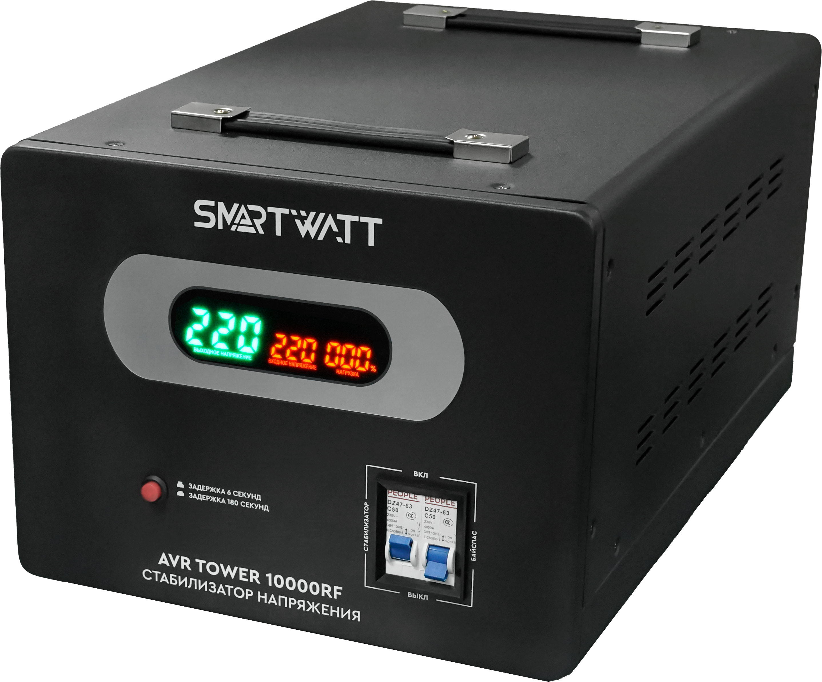 Стабилизаторы SMARTWATT AVR TOWER обладают базовым функционалом и разработаны специально для бытовой техники. Устройства работают в диапазоне от 140 до 260 В, что позволяет стабилизировать как повышенное, так и пониженное напряжение. Стабилизаторы SMARTWATT AVR TOWER оснащены информативным дисплеем, встроенным байпасом (в моделях от 3кВА) и функцией задержки на включения. Среди прочих особенностей — релейное переключение при помощи микропроцессора и функция ZeroCross.