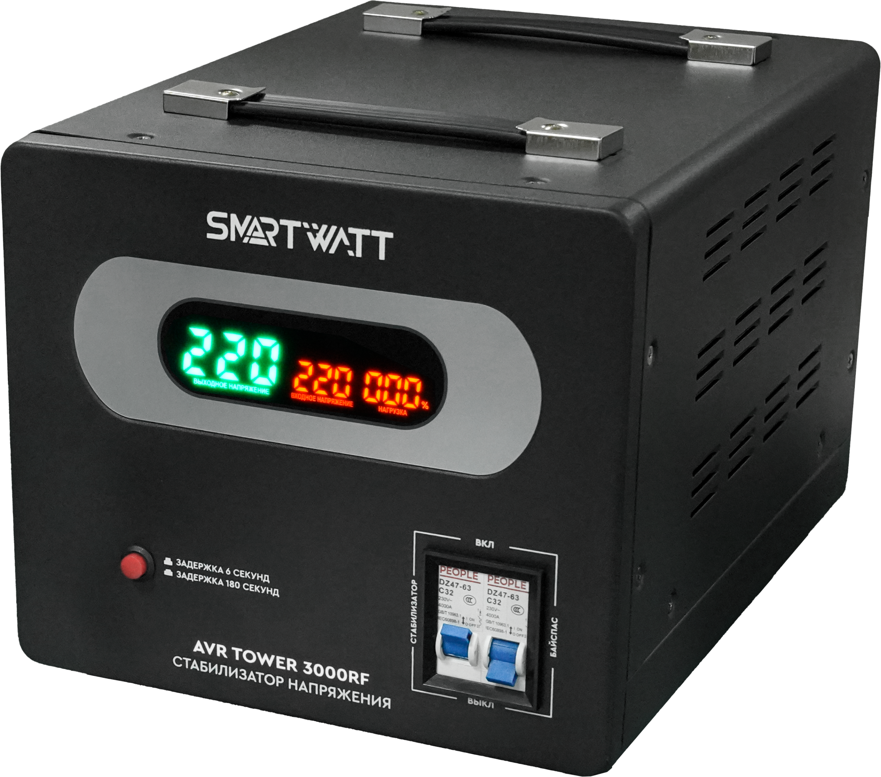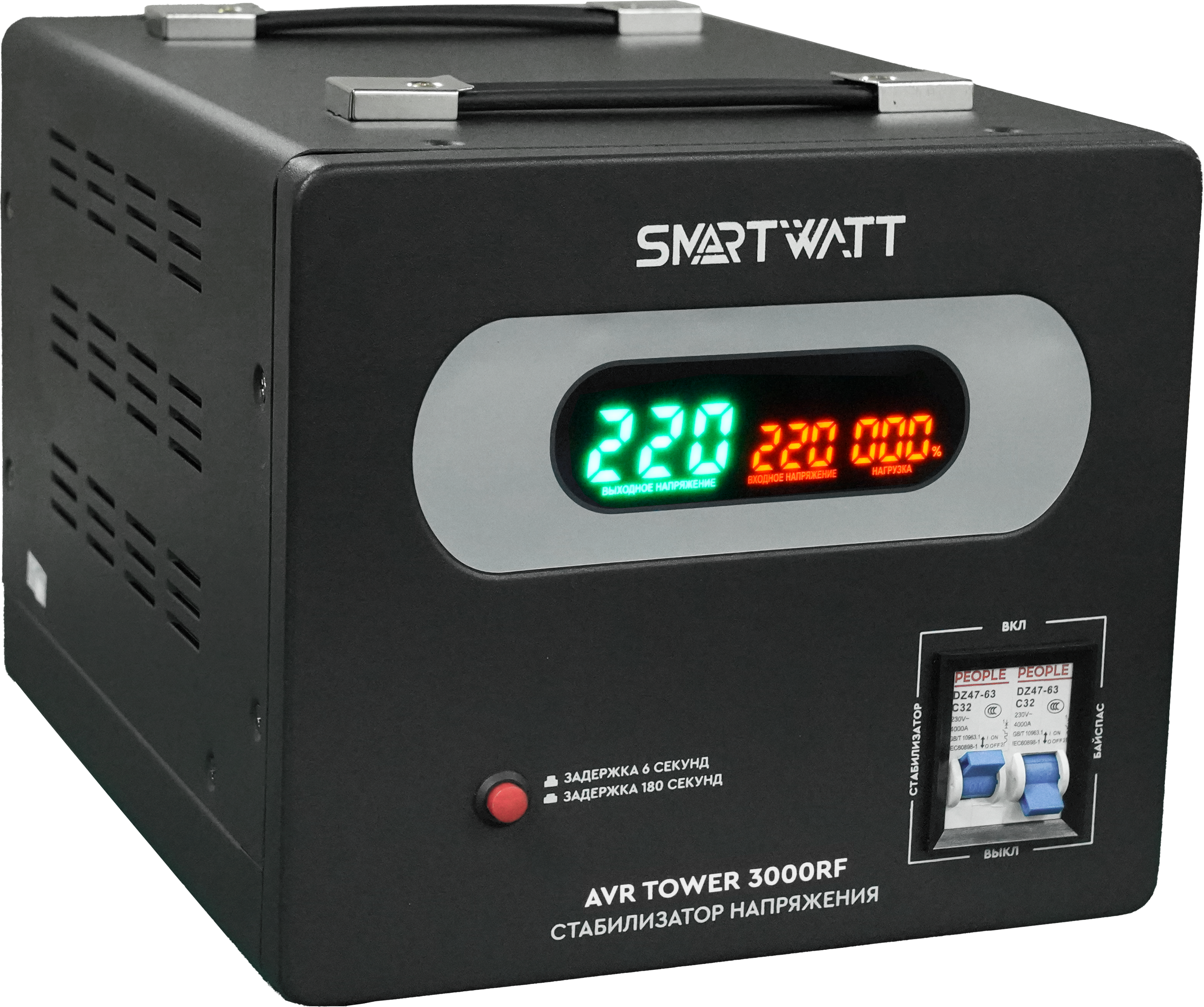 Стабилизаторы SMARTWATT AVR TOWER обладают базовым функционалом и разработаны специально для бытовой техники. Устройства работают в диапазоне от 140 до 260 В, что позволяет стабилизировать как повышенное, так и пониженное напряжение. Стабилизаторы SMARTWATT AVR TOWER оснащены информативным дисплеем, встроенным байпасом (в моделях от 3кВА) и функцией задержки на включения. Среди прочих особенностей — релейное переключение при помощи микропроцессора и функция ZeroCross.