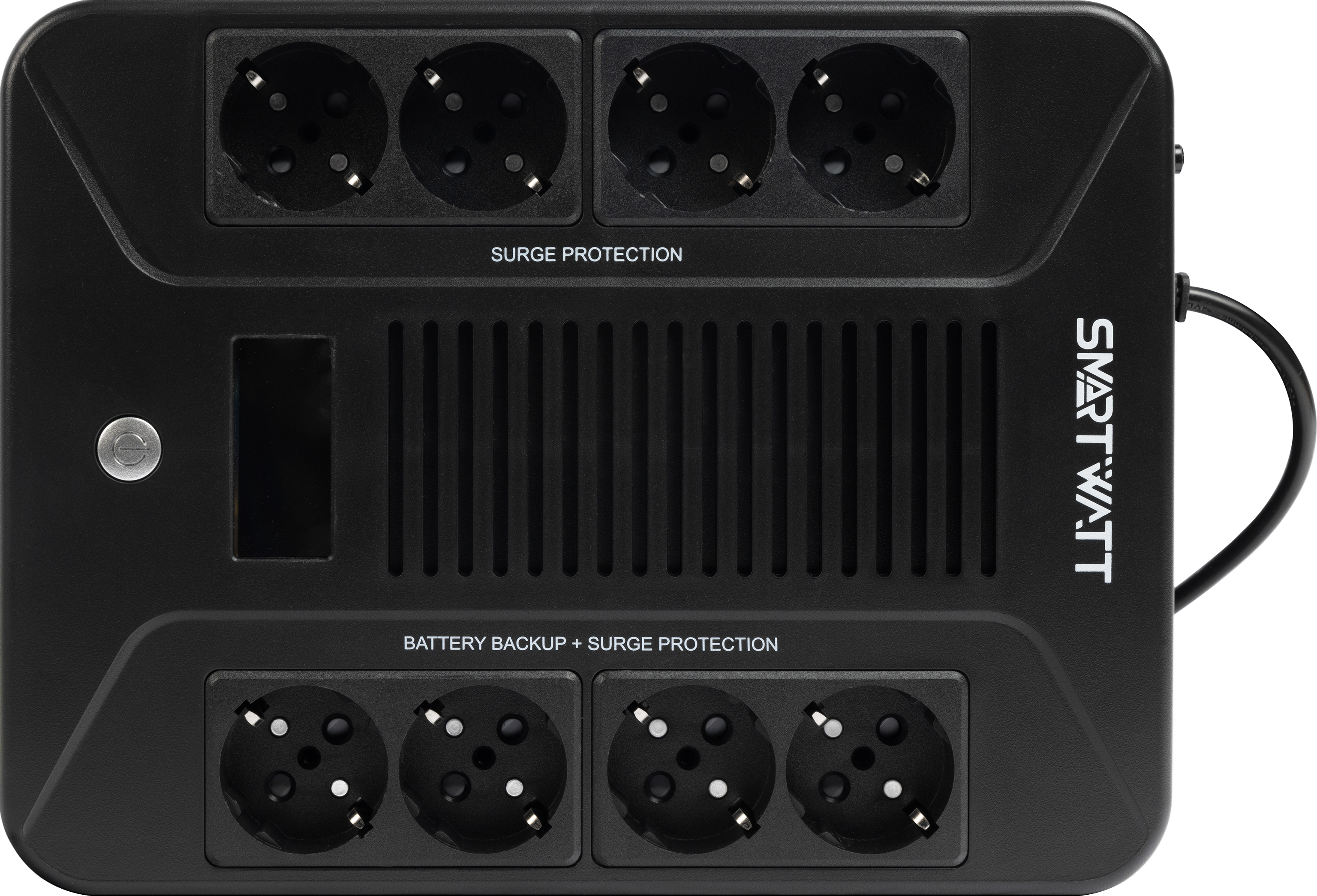 Линейно-интерактивные ИБП SMARTWATT UPS SAFE PRO LCD для офисного оборудования оснащены дисплеем, на котором отображается статус работы и выходное напряжение. Приборы выполняют функцию стабилизатора напряжения — защищают от перепадов при нестабильной сети. USB-порт позволяет мониторить состояние электросети и АКБ через ПК. Источники бесперебойного питания SMARTWATT UPS SAFE PRO LCD имеют 8 евророзеток (4 с функцией резервирования) и понятную LED-индикацию. При необходимости ИБП можно разместить на стене для экономии пространства и удобства пользователя.