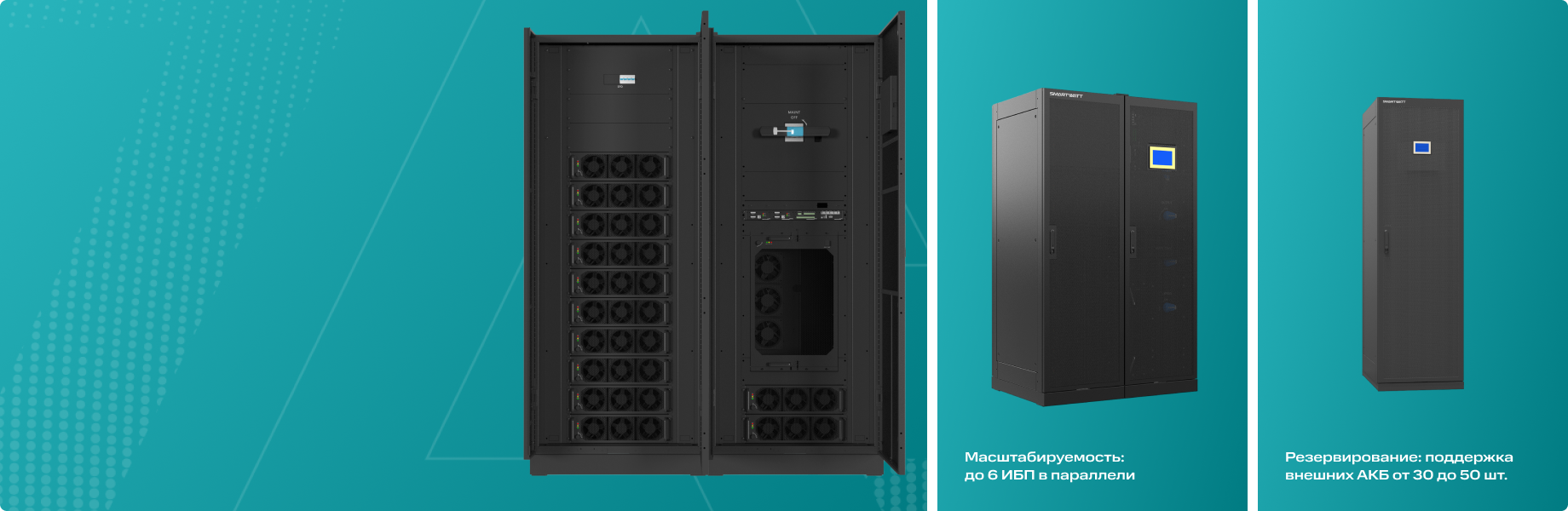 Широкий диапазон входного напряжения обеспечивает стабильную работу при сильных просадках в сети. Вы можете наращивать мощность, добавляя новые силовые блоки, и подключать необходимое количество внешних аккумуляторов для длительного резерва. Управляйте системой через интуитивный интерфейс и отслеживайте ее состояние удаленно по протоколам Web, SNMP или Modbus.