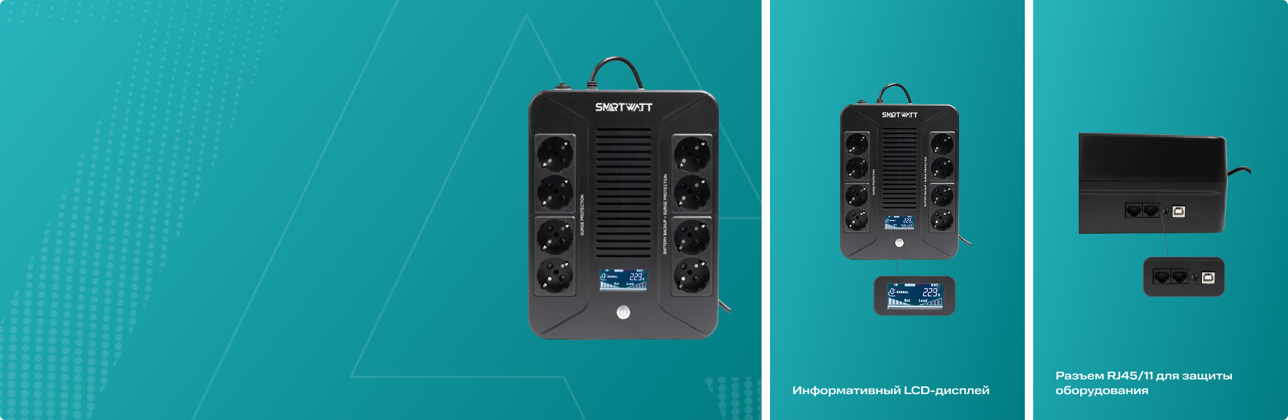 Линейно-интерактивные ИБП SMARTWATT UPS SAFE PRO LCD для офисного оборудования оснащены дисплеем, на котором отображается статус работы и выходное напряжение.